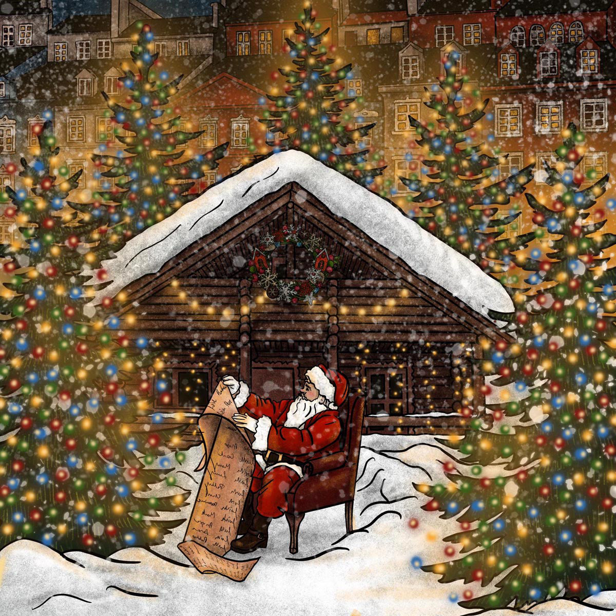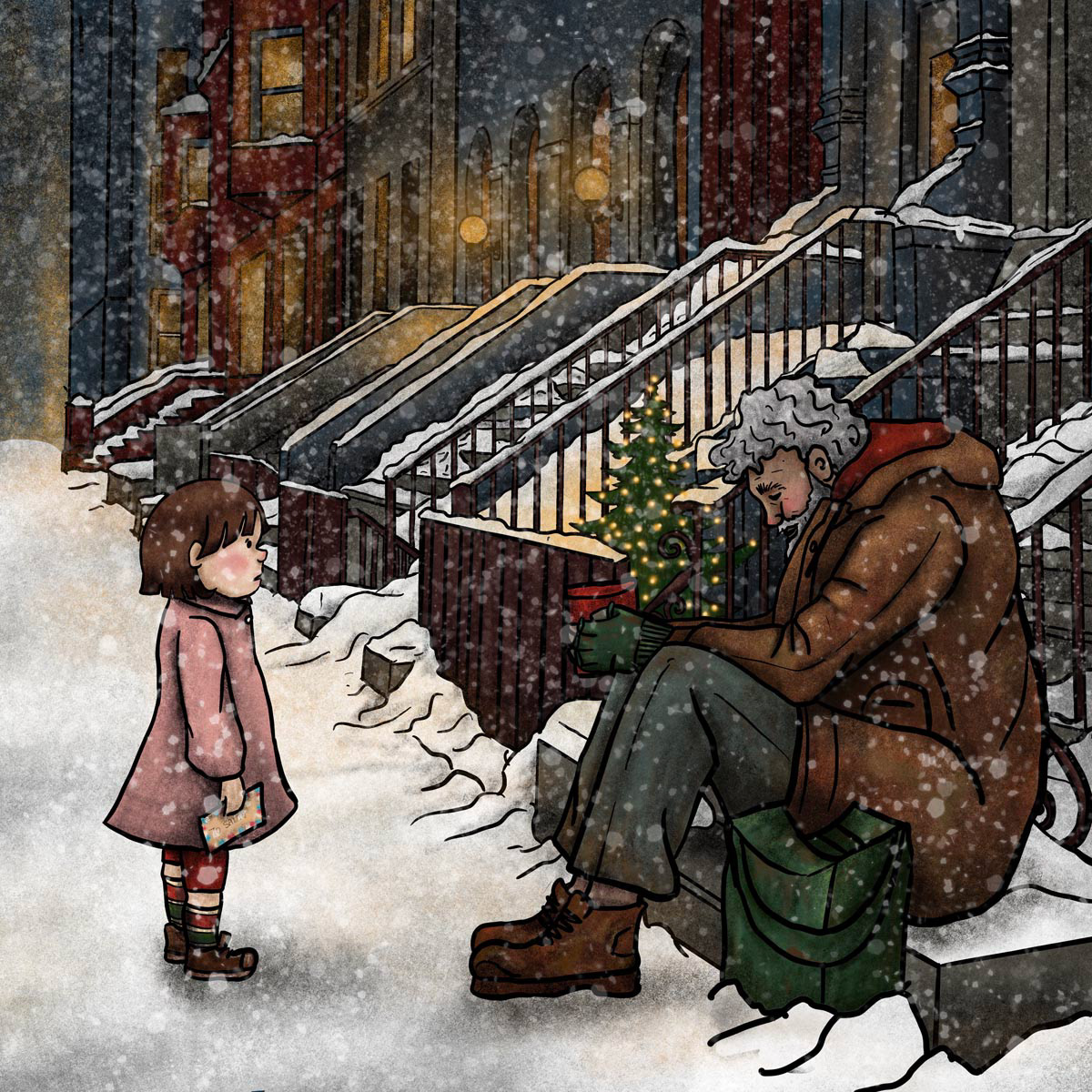 Sample illustrations from an unpublished Christmas-themed children's book. The story follows a young girl on a magical journey to deliver her letter to Santa, discovering kindness and unexpected warmth along the way.